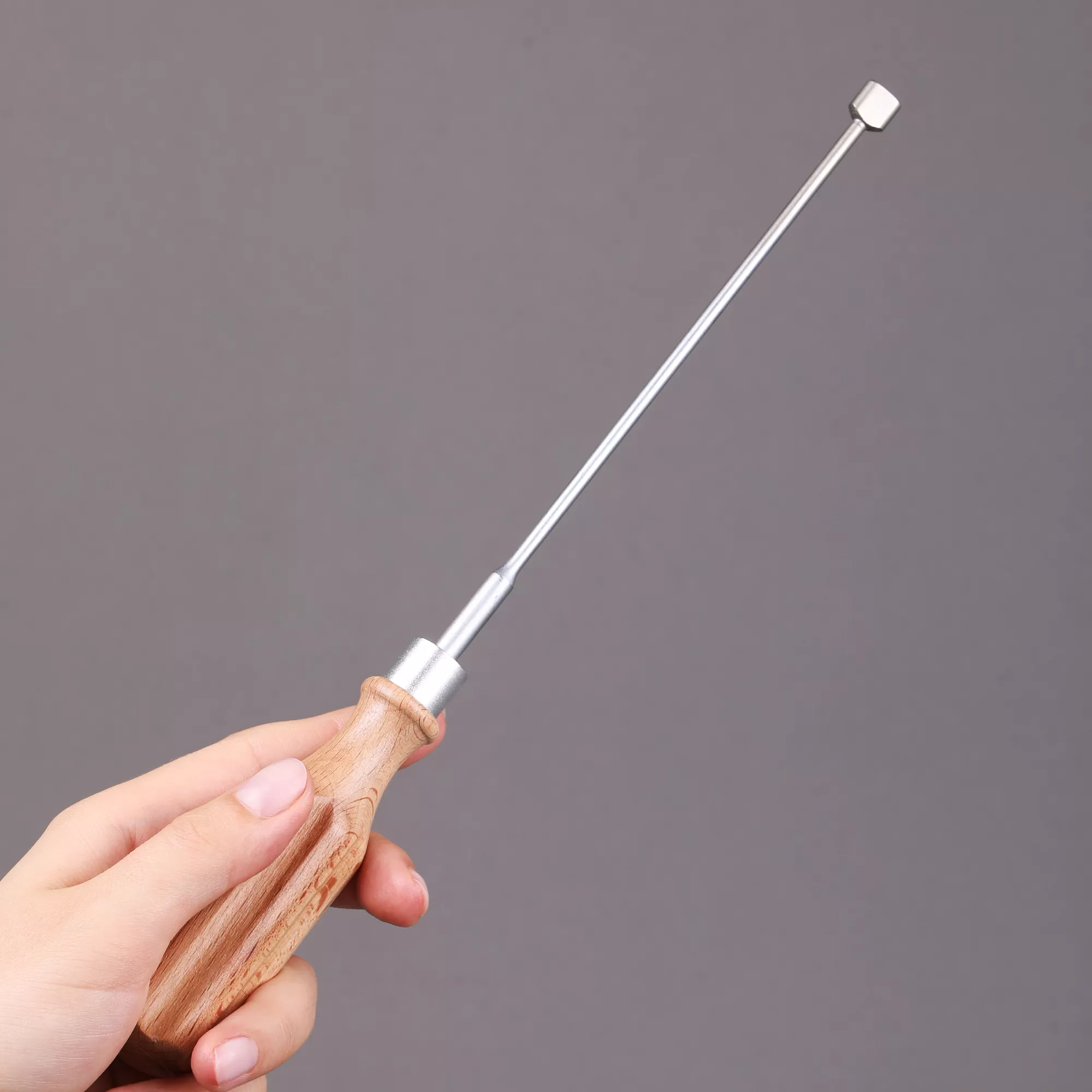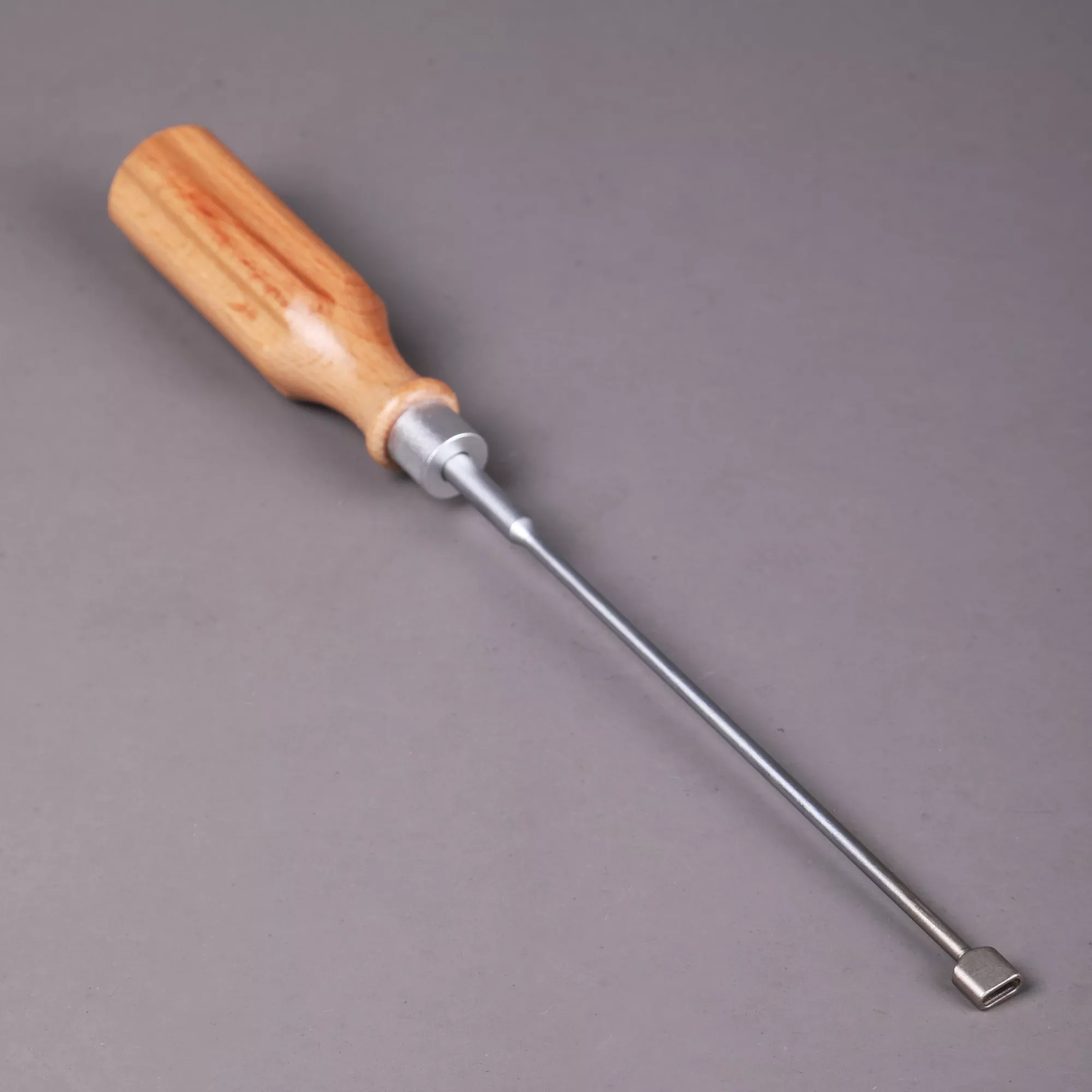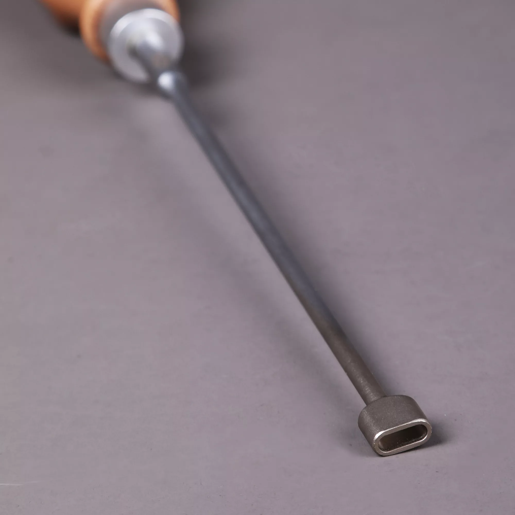 Ключ для регулировки винта срыва молоточка (ауслезинг) с овальной насадкой предназначен для точной регулировки винта Auslöser (срыва, let-off) на репетиторе рояля. Овальный «стакан» надёжно охватывает головку и позволяет работать малыми углами без излома. Тонкий стержень позволяет установить ключ без риска повреждения других деталей (гаммерштили и т.д.)
