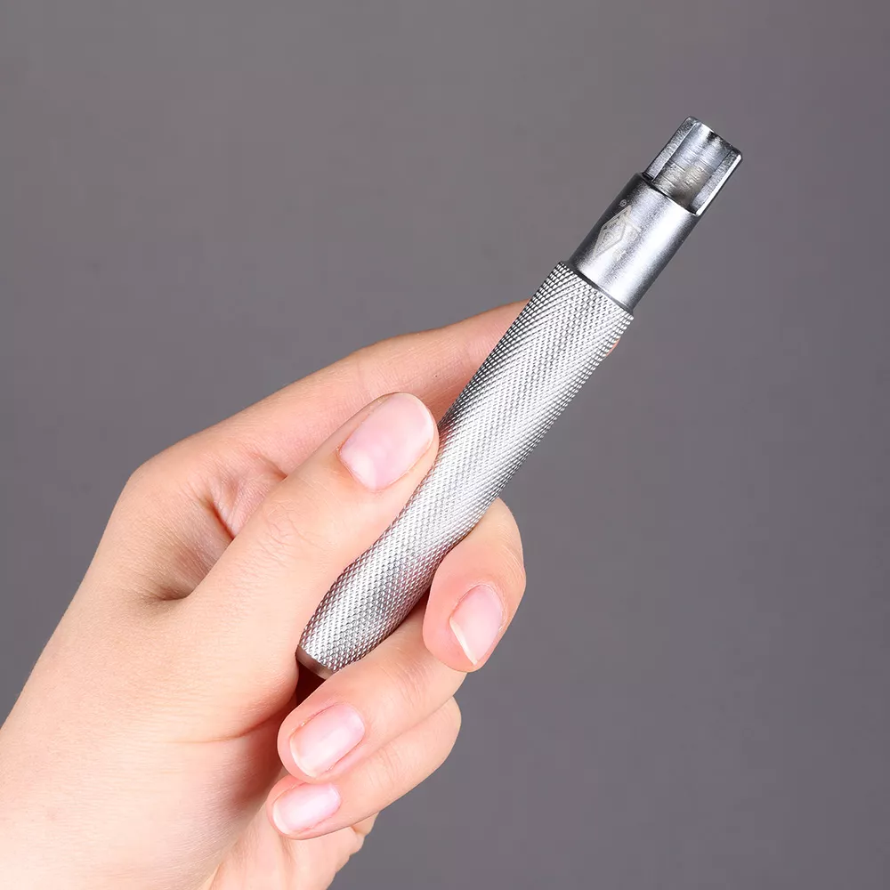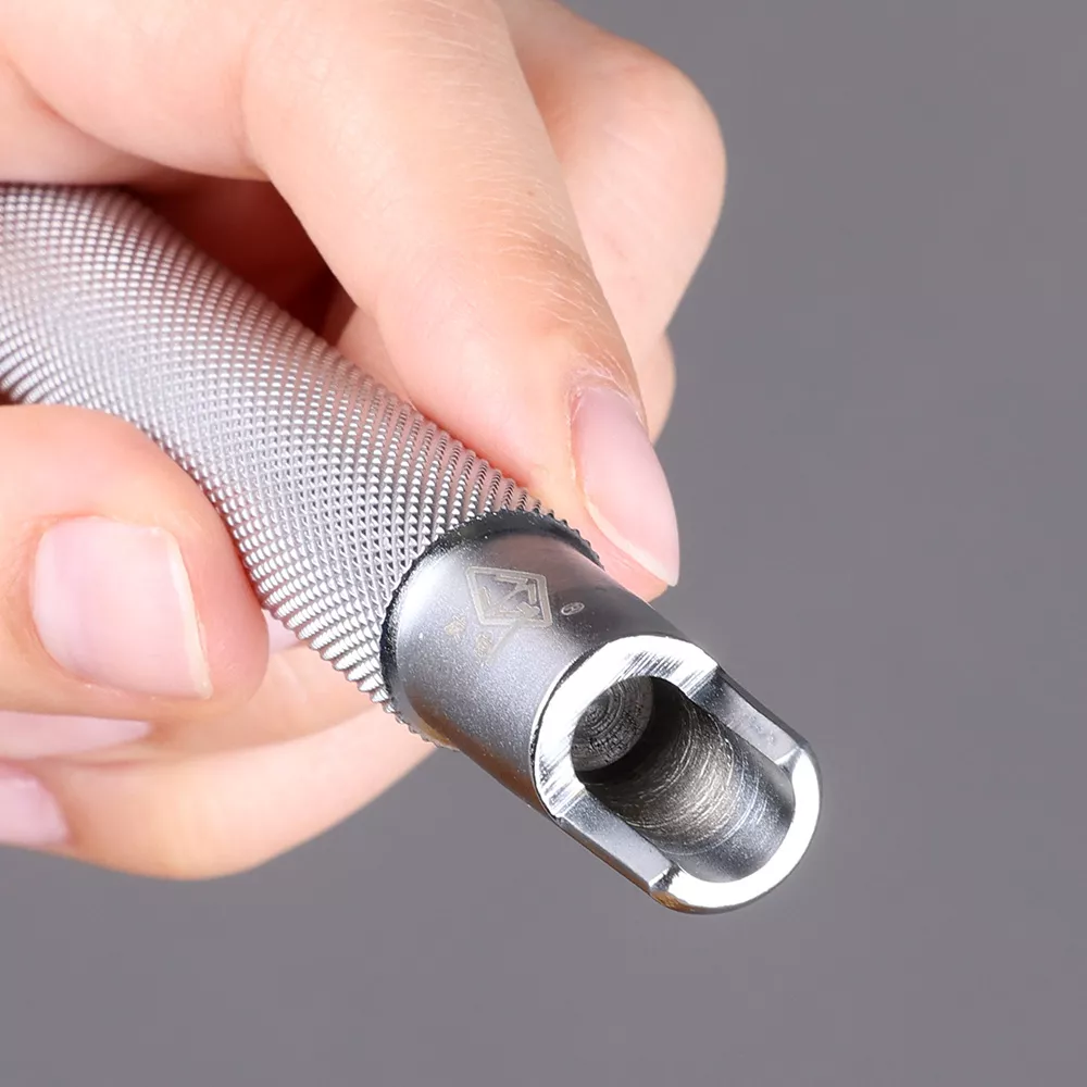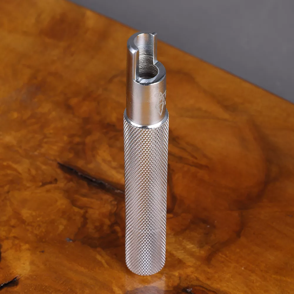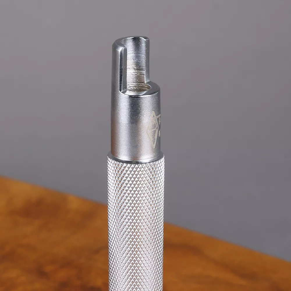 Рабочая часть выполнена в форме насадки под вирбель, а металлическая рукоятка с накаткой обеспечивает уверенный хват во время работы. Такой инструмент полезен в мастерской реставратора, настройщика и мастера по перетяжке струн, а также для работы на выезде, или для самостоятельного ремонта фортепиано.