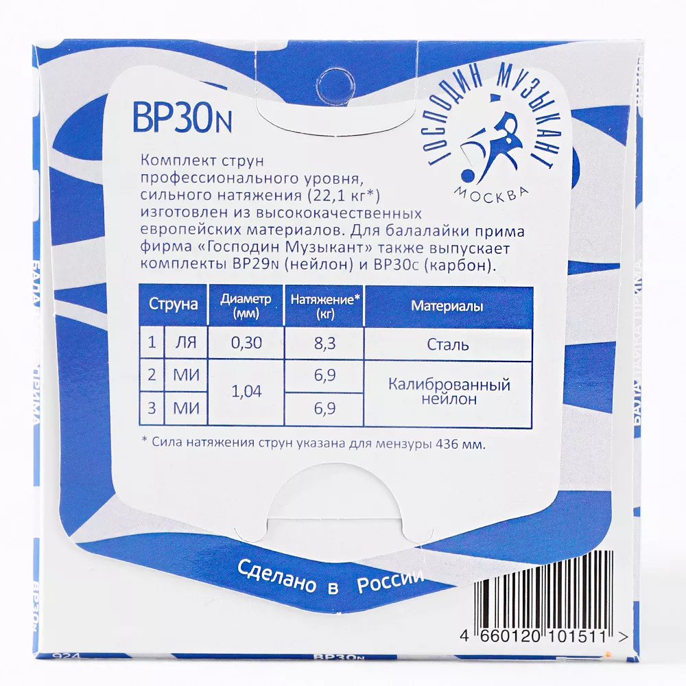 Комплект струн для балалайки прима Господин Музыкант BP30n синяя 0,30