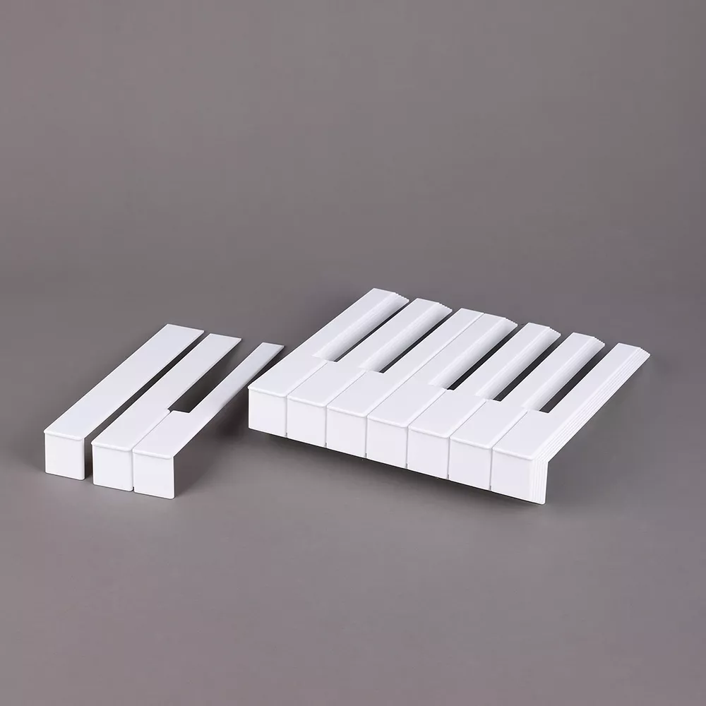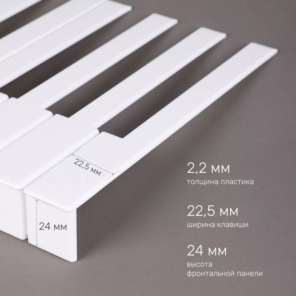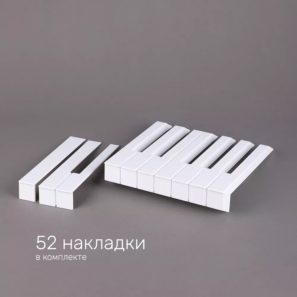 - Комплект из 52 накладок — полный набор для белых клавиш стандартной фортепианной клавиатуры.