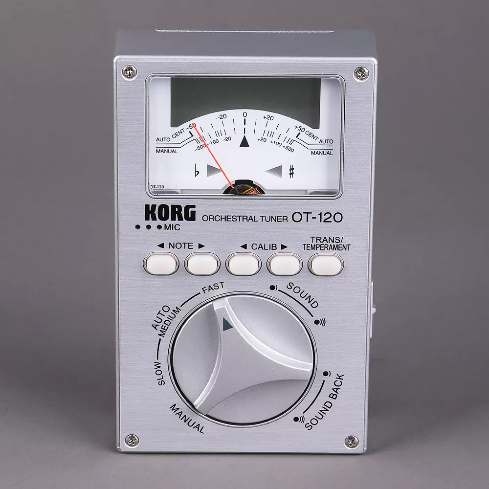 Оркестровый тюнер KORG OT-120 — точный хроматический тюнер профессионального класса для настройки музыкальных инструментов в мастерской, учебном классе, репетиционной комнате и на сцене.