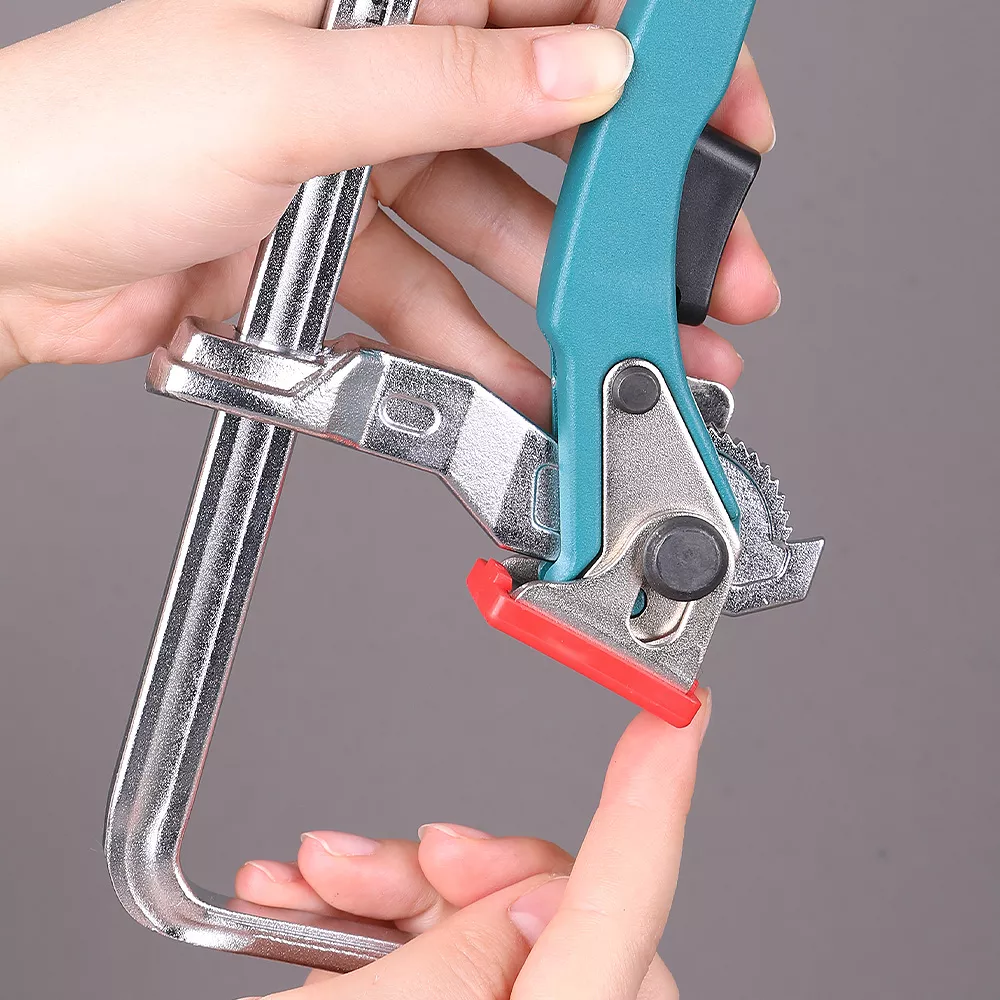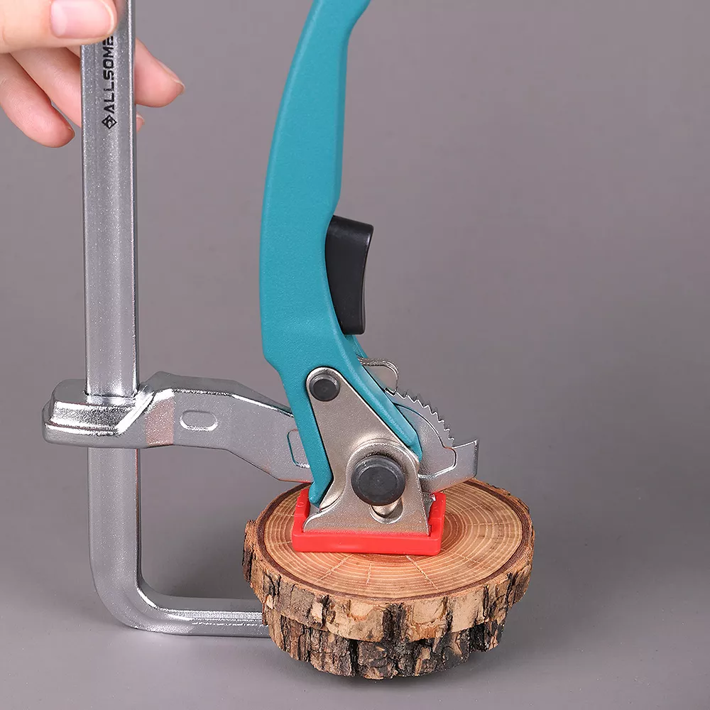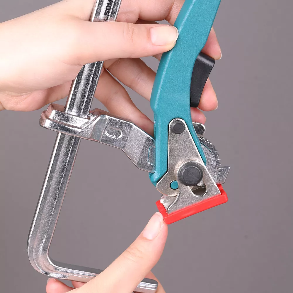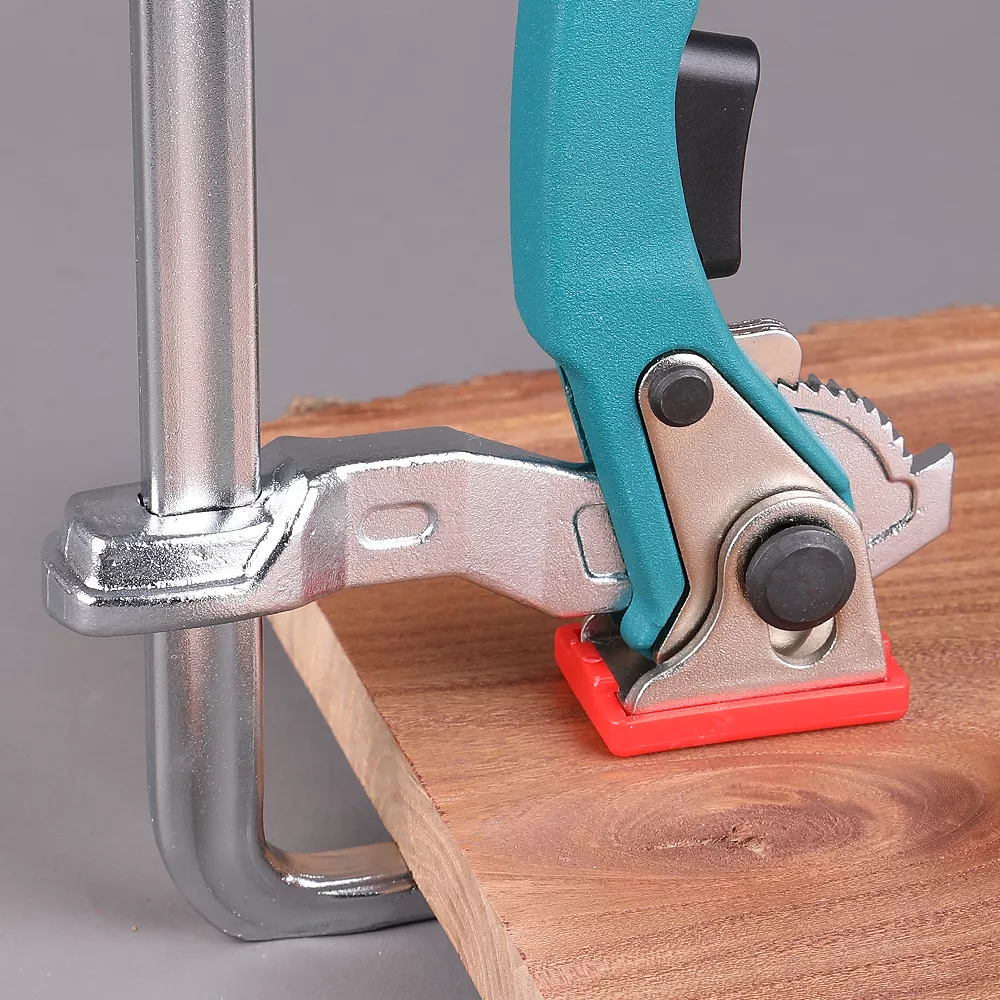 Удобная струбцина с курковым (трещоточным) механизмом — позволяет фиксировать деталь одной рукой и быстро выставлять прижим без долгой прокрутки винта. В мастерской по ремонту пианино/роялей такая струбцина особенно полезна для клеевых и подгоночных работ с небольшими деталями.
